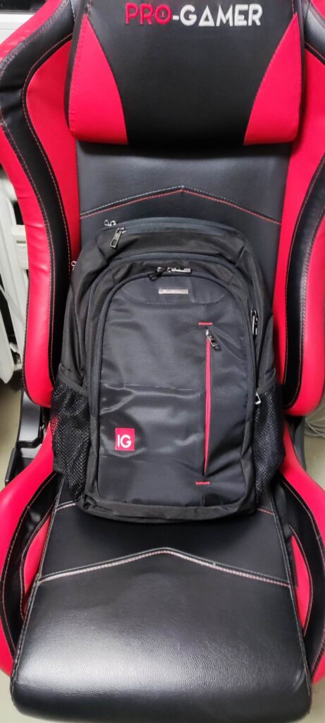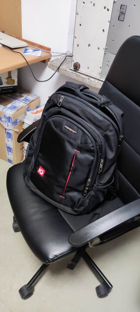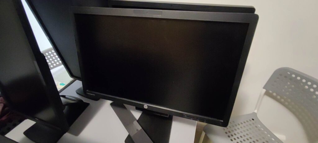 z monitorami, 2 laptopy z dedykowanymi plecakami transportowymi oraz krzesła biurowe